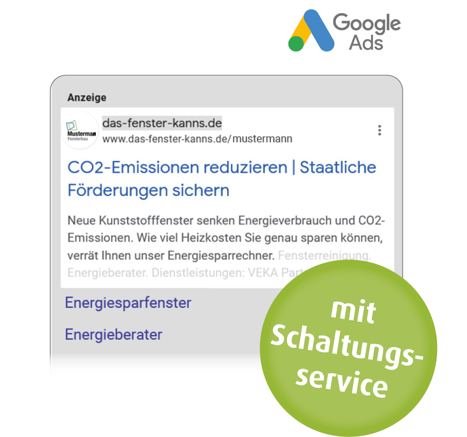 Unser neuer Service unterstützt Sie beim Suchmaschinenmarketing mit Google Ads. Mit diesen hocheffizienten Anzeigen können Sie alle, die sich für neue Fenster interessieren und die in Ihrer Region entsprechende Suchbegriffe bei Google eingeben, auf Ihre Kampagnen-Landingpage oder Unternehmens-Homepage lenken.